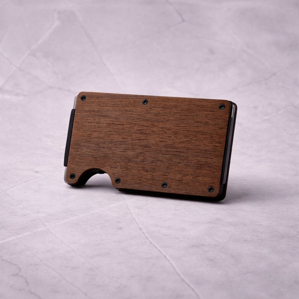 Minimalistická dřevěno-hliníková peněženka kombinující odolnost kovu a přirozený vzhled skutečného dřeva.