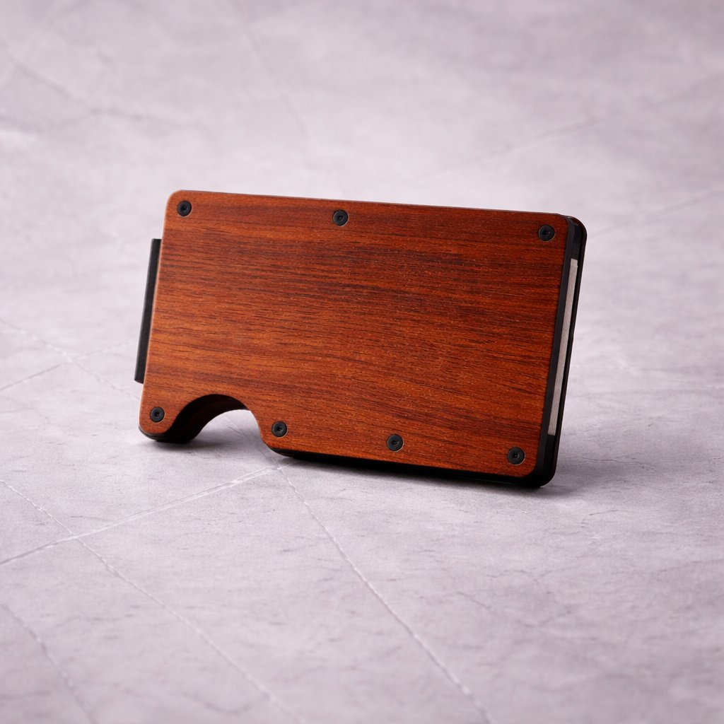 Minimalistická dřevěno-hliníková peněženka kombinující odolnost kovu a přirozený vzhled skutečného dřeva.